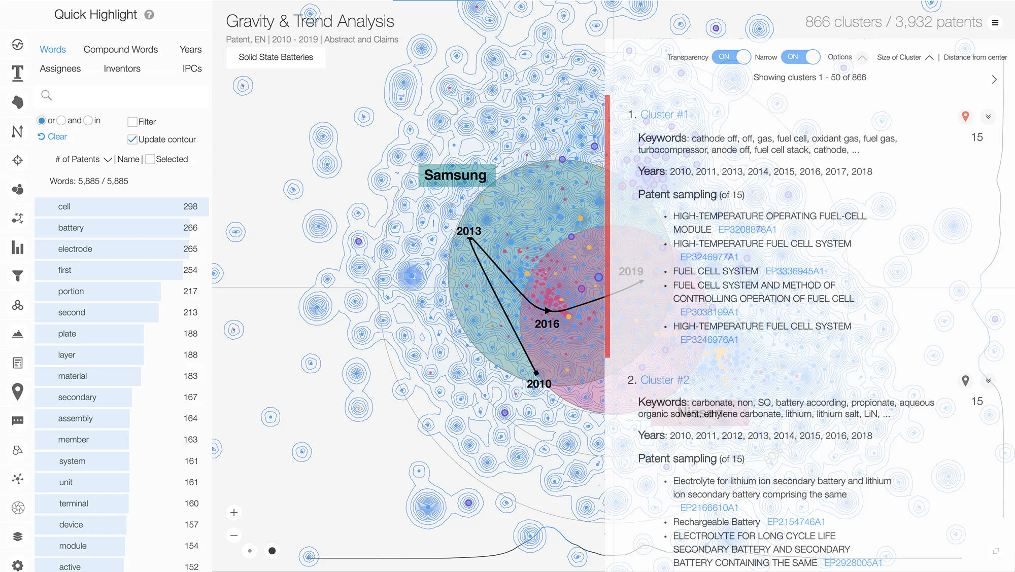 俯瞰図を眺めて全体的な傾向や動向を把握したら、次は気になるエリアの詳細を見てみましょう。クラスター内のテキスト情報を読み込んだり、エリアを構成するキーワードの抽出や、フィルターを設定して特定の技術に焦点を当てて俯瞰図を見直す等、ミクロな視点での表示が可能です。